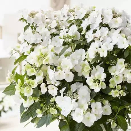 İlk çiçəklənmədən sonra yeni tumurcuqlarda yeni terminal çiçək qönçələri görünür və bununla da çiçəkləmə müddəti payıza qədər uzanır.Çiçəkli bitki bağda daha geniş istifadə sahəsinə malikdir və parlaq ağ rəng məsumluğu və saflığı, lütf və zərifliyi simvollaşdırdığı üçün ideal bir toy çiçəyi ola bilər.Çiçəklənmələr soyuq havalarda təmiz ağ, çox vaxt çəhrayı rəngli böyük, zərif, steril çiçəklərlə bəzəyir. Çiçəklərin sayı 8-dən 10-a qədər steril, məhsuldar 330. Apreldən iyun-sentyabr aylarına qədər təbii çiçəkləmə dövrüdü. Çiçəklənmə hündürlüyü 8,5 sm, eni 13,5 sm, orta hündürlüyü 50 sm, eni 100 sm.
